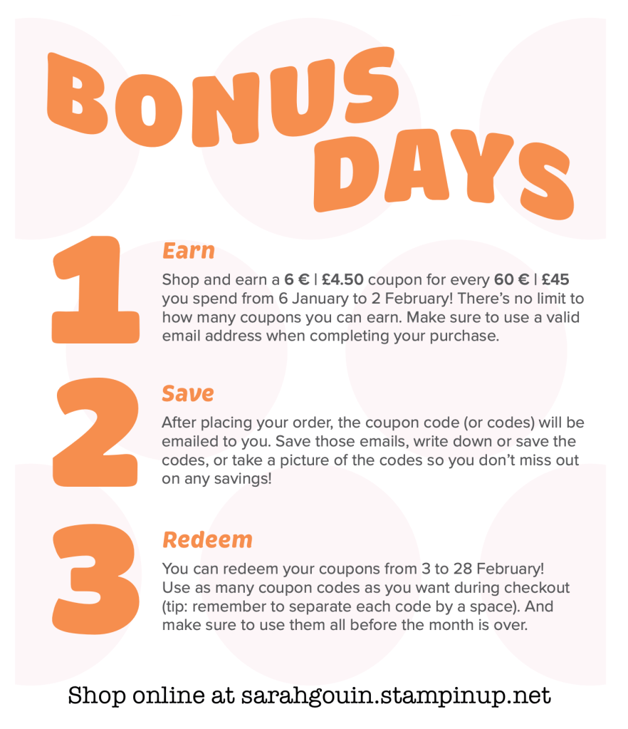 As 2026 is around the corner, it’s time for one of my favourite promotions—BONUS DAYS! Get rewarded for all the crafting supplies you buy between 6 January and 2 February as, when you spend 60 € | £45, you will earn a 6 € | £4.50 coupon! Make sure you save all your coupons because you can redeem them (and that means ALL of them) between 3 and 28 February. And don’t forget—each purchase earns you Stampin’ Rewards so that’s even more value for money!