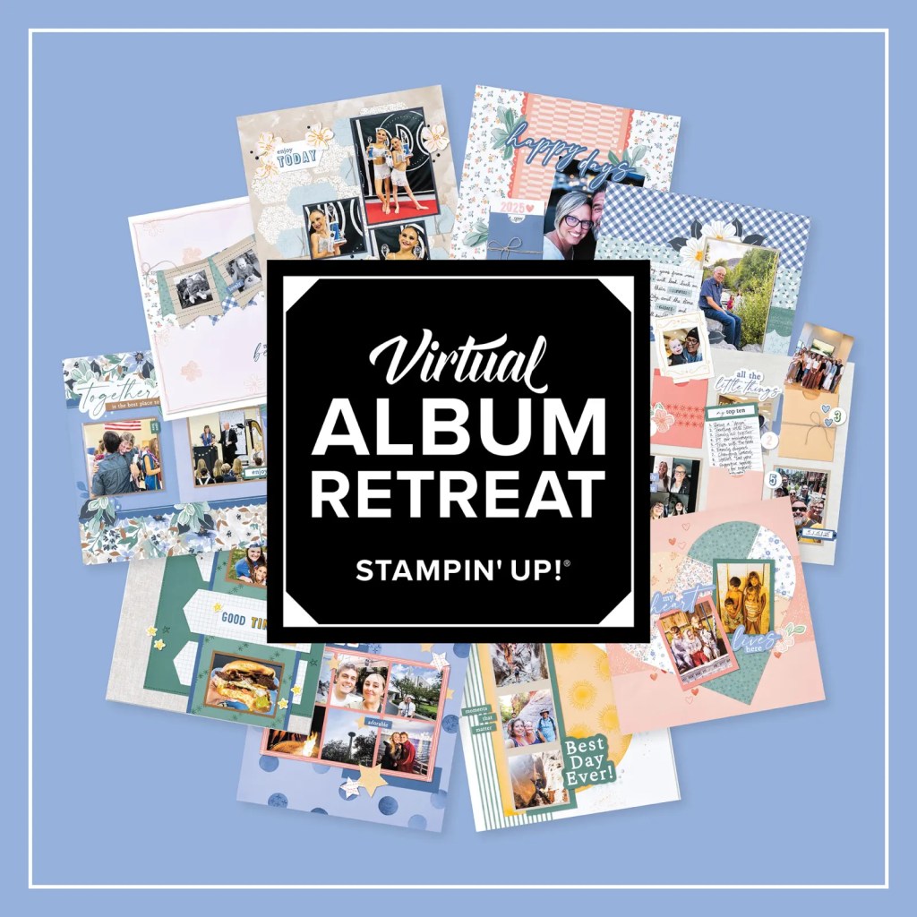 This April we have a Virtual Album Retreat, a three-day, virtual event where you’ll craft along with Stampin’ Up! staff as they go through the step-by-step process of creating a 10-spread scrapbook album using the 2026 Virtual Album Retreat Happiness is Here kit.
